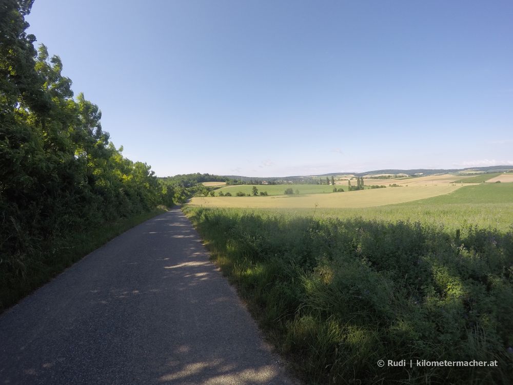 Weiter westlich, dann wieder ein Schwenk nach Norden, Richtung Tschechien. Es wechselt Asphalt, Wald und Wiese, wieder Asphalt, eher eintönig. Getränke und Jause in kleinen Greißlereien kaufen und auf einer Bank verzehren. Ich fahre auf Teilstrecken des ICT, den March-Damm eine Weile entlang, überhole etliche Schulklassen…