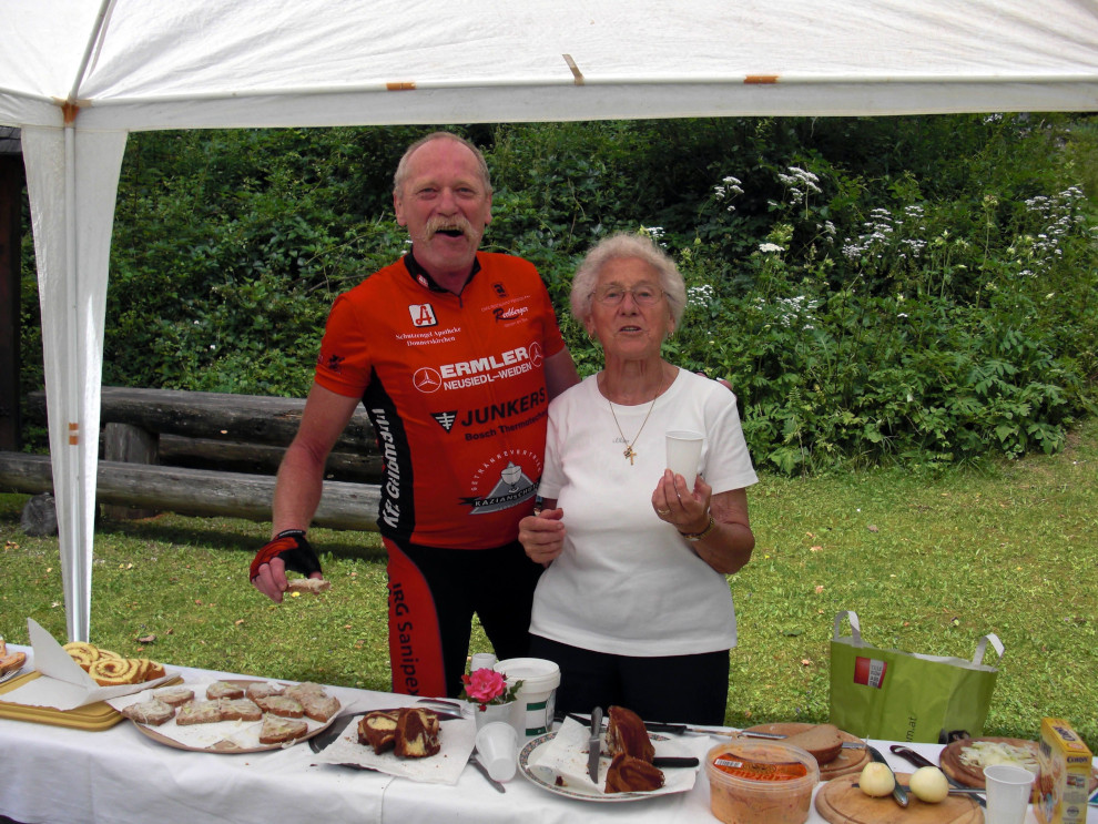 Gleich darauf beginnt es anständig zu regnen – na also, sind wir ja bei diesem Marathon gewohnt… Von hinten kommen noch zwei Fahrer, in Sichtweite vor uns eine Vierer-Gruppe. Also rackern wir abwechselnd anständig und in Spital am Pyhrn sind wir endlich dran – und ich bin „blau“. Dementsprechend wackel ich den Pyhrnpass hinauf, verfluche meine Nikotinsucht und muß einige Fahrer ziehen lassen. Zwischen Abfahrt Pyhrnpass und Anstieg Hengstpass kann ich endlich wieder an eine Gruppe anschliessen, ich bin wieder halbwegs im „grünen“ Bereich und gemeinsam fahren wir weiter. Der Hengstpass tut eigentlich nicht weh (in der Gruppe ist es leichter), bei der Labe bleiben wir stehen, eine Kleinigkeit essen, Flaschen nachfüllen, und weiter geht’s. Zum Regnen hat es auch irgendwo aufgehört (wir werdenaber trotzdem noch einmal irgendwo nass, das ist uns aber egal…). Wellig geht’s weiter, der Anstieg zum Erbsattel ist wieder recht hart, dann immer wieder wellig mit ein paar (für mich) giftigen Anstiegen, aber ich bleib an der Gruppe dran (an dieser Stelle ein Dank an die Mannen vom „AMS-Bike-Team Rottenmann“ für’s lutschen lassen!). Endlich sind wir bei der Labe Gstatterboden – ein Kaffee, ein Zigaretterl, ein paar Verhackert-Brote mit Zwiebel und Paradeiser, ein Cola, ein Kuchen… – da werden die Speicher vor Kaiserau noch richtig angefüllt. Wir sind ungefähr bei km 105, das Ziel scheint richtig nah – wäre da nicht der Anstieg nach Kaiserau. Ich denke an das Vorjahr, halte mich etwas zurück, damit ich nicht wieder mit Puls 165 in den Anstieg komme und trotzdem – irgendwo in der Mitte der Auffahrt muß ich kurz vom Rad, meine Bergfahrqualitäten sind unter aller Sau… Bei der letzten Labe ein kurzer Stopp, die Kollegen aus Rottenmann bleiben sitzen und genehmigen sich ein paar übrig gebliebene Biere (wir sind – angeblich – definitiv das letzte Packl), ich fahre aber weiter. Endlich geht’s nur mehr bergab, von den angekündigten schlechten Straßenverhältnissen (viel Streu-Split in den Kurven und überhaupt) ist eigentlich nicht viel zu sehen und ich rase hinunter. Leider ist dann auf den letzten Kilometern noch Gegenwind und weit und breit niemand zu sehen. So fahre ich von Dietmannsdorf nach Selzthal alleine und bin nach 6:26:irgenwas als 85. im Ziel…